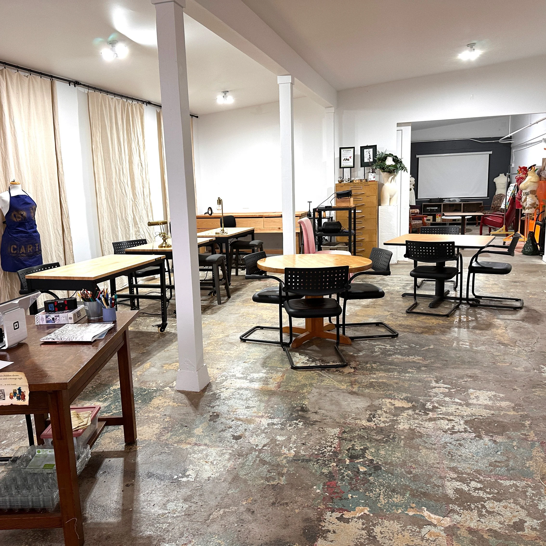 Open, light-filled, and equipped with work tables and stools. Built for messy art, building projects, and group classes with real elbow room.